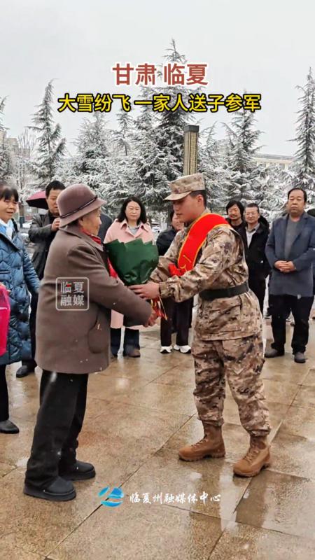 一人参军,全家光荣。在一场春雪中,全家人送子参军。合照藏牵挂,少年赴荣光。