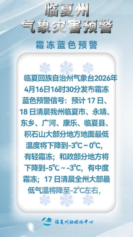 临夏州气象台发布霜冻蓝色预警信号