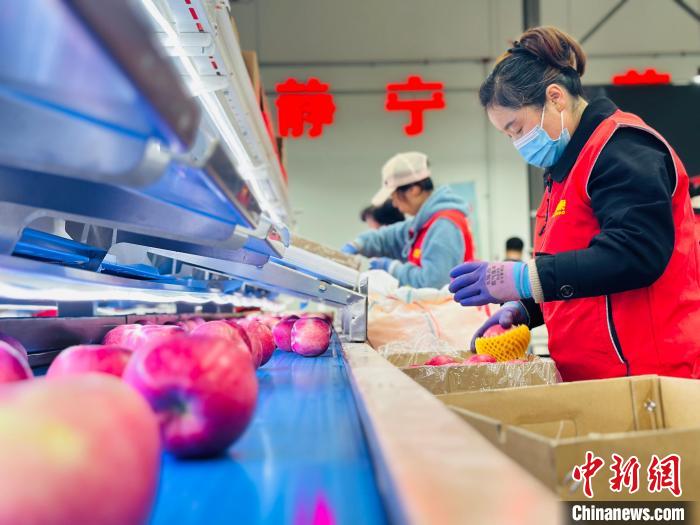 10月16日,甘肃平凉市静宁县,德美地缘现代农业集团有限公司生产车间,工人辅助自动化设备挑拣分类苹果。魏建军 摄