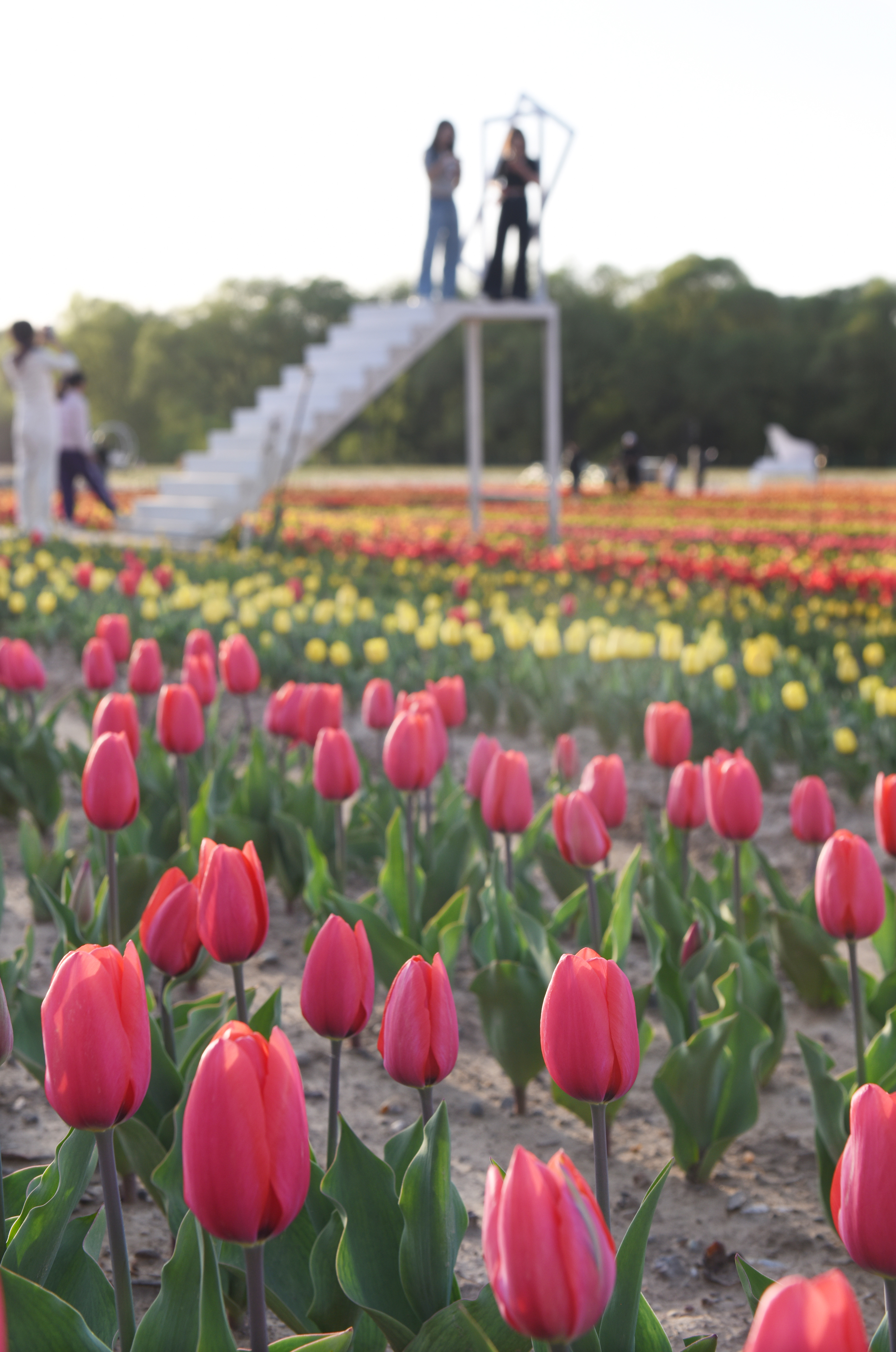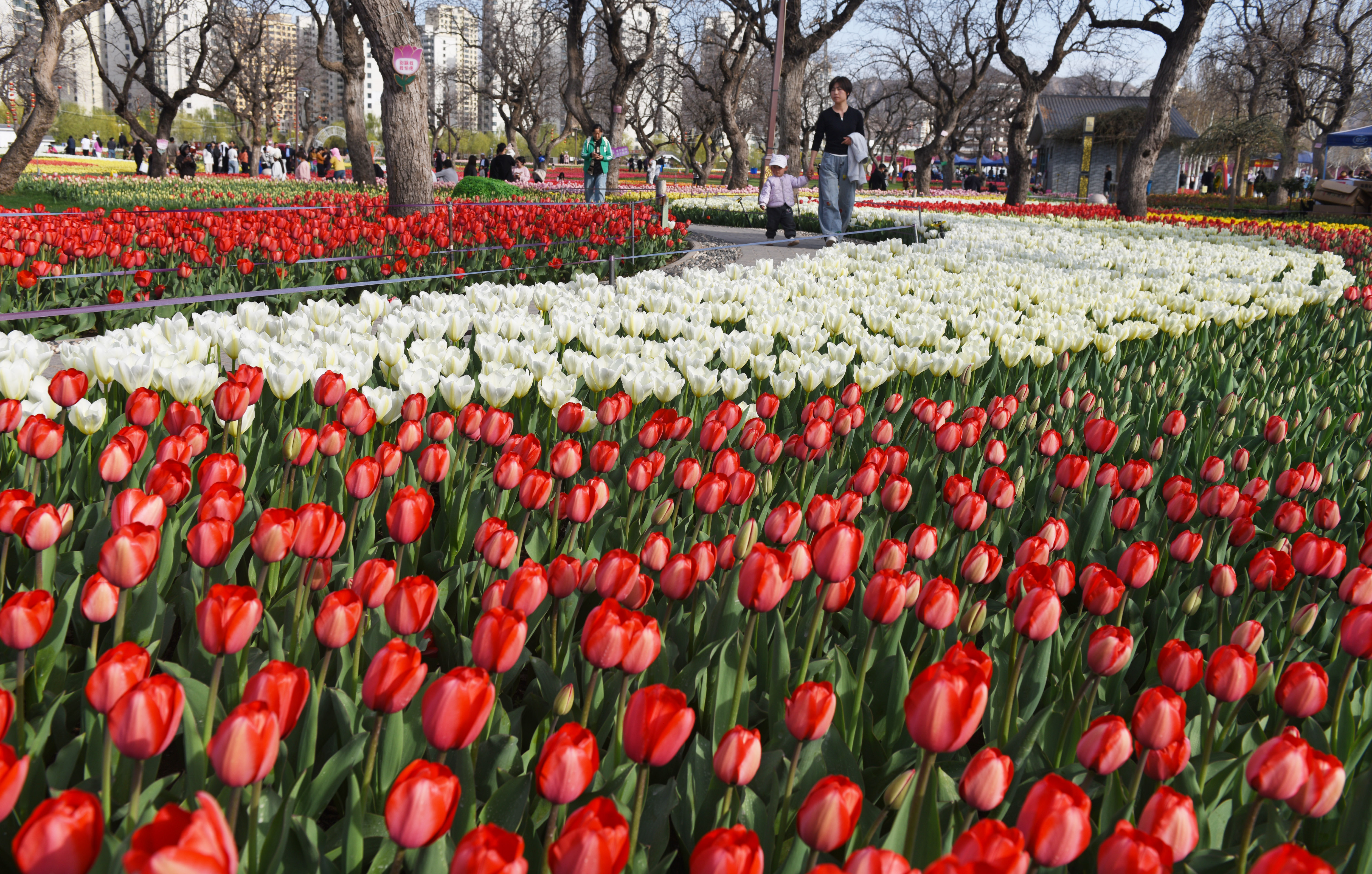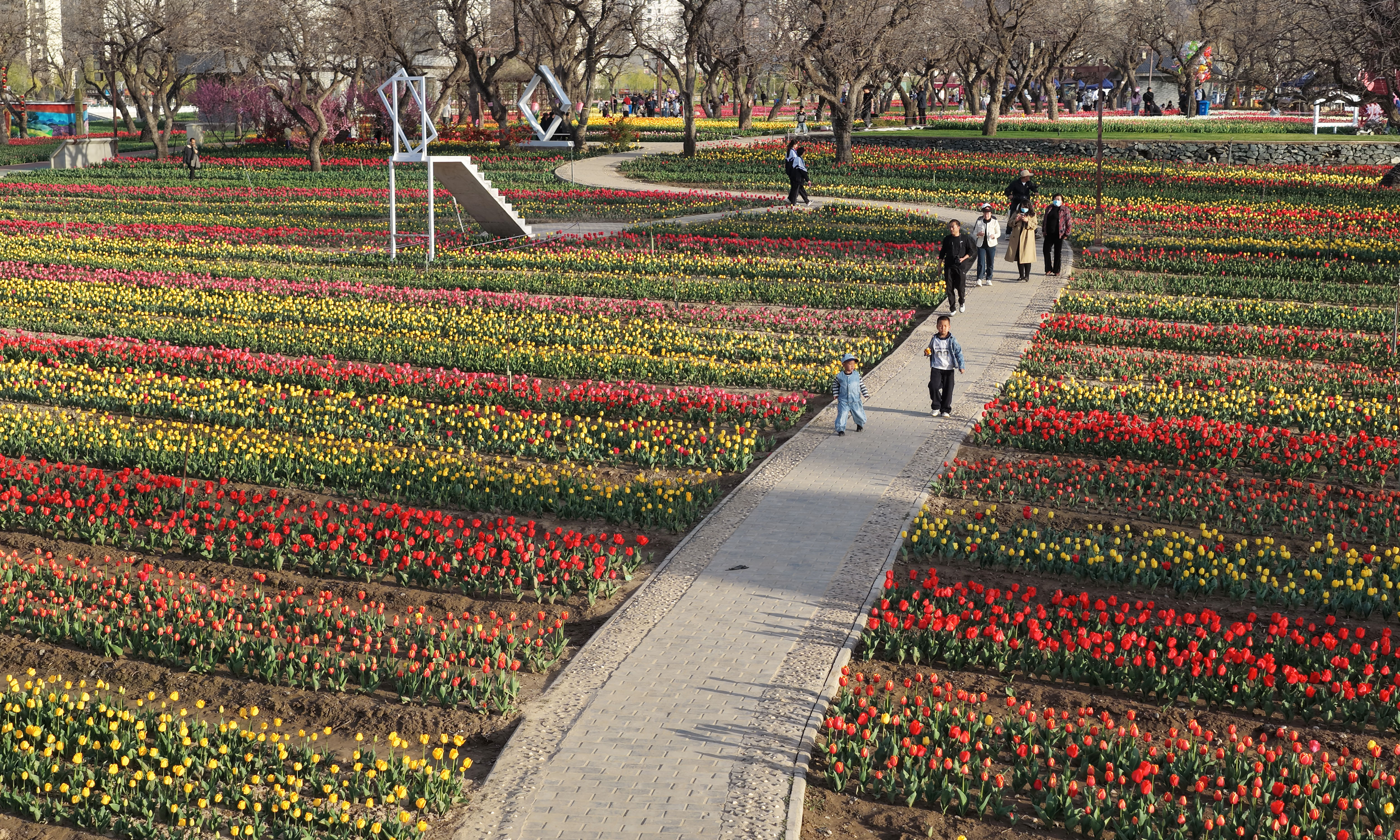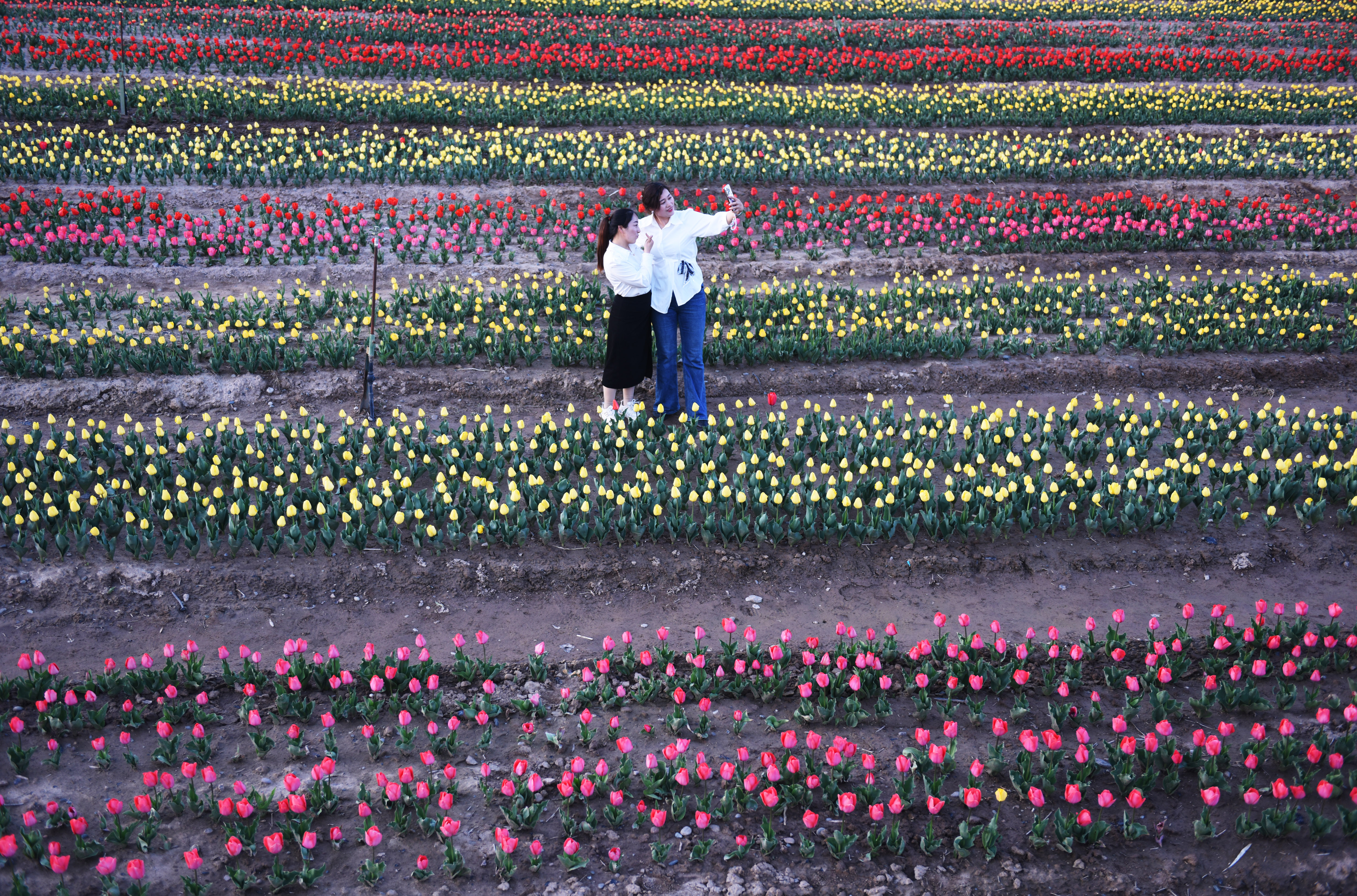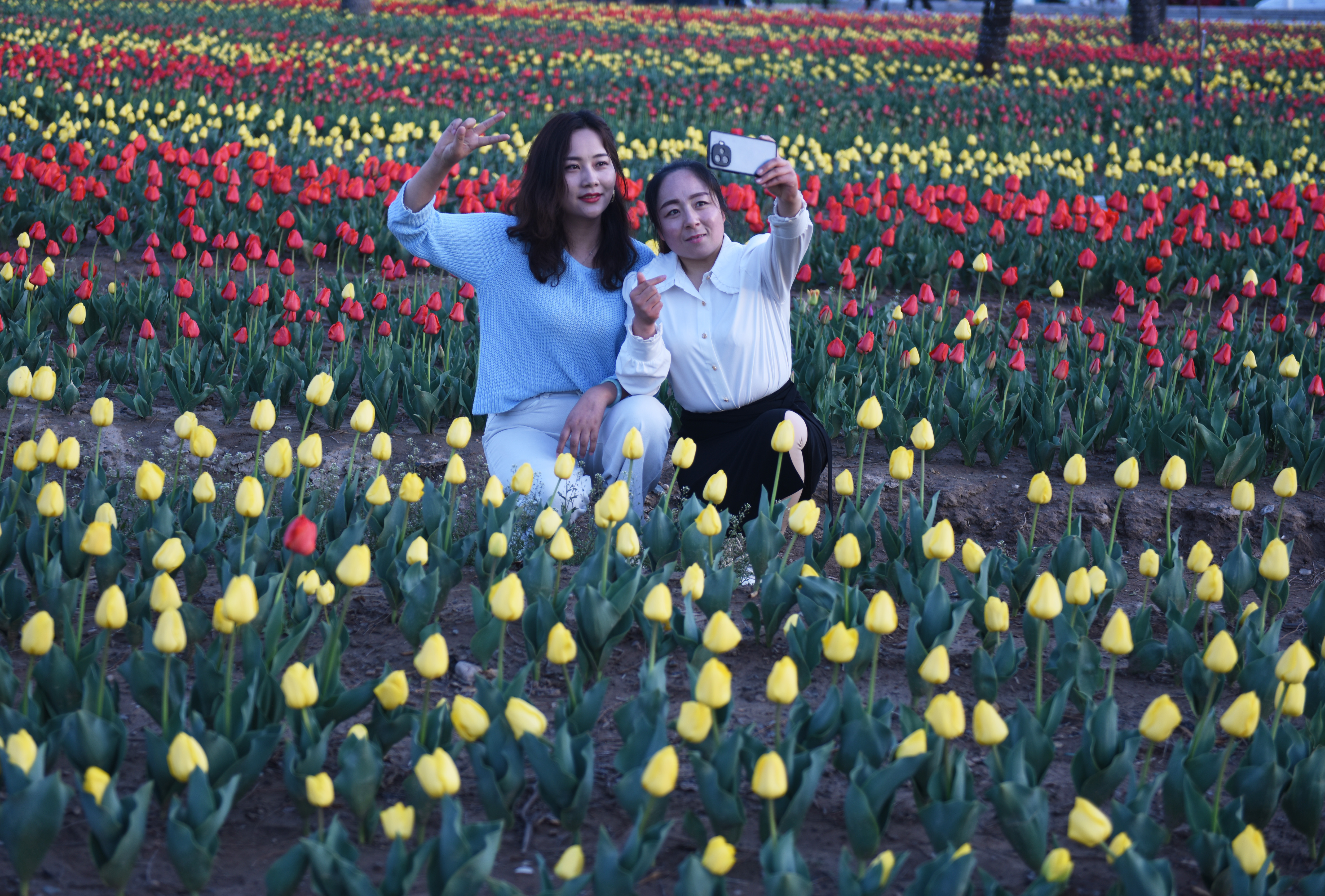 4月9日,游客在永靖县刘家峡镇欣赏郁金香