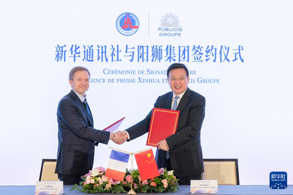 5月4日,新华通讯社社长傅华同阳狮集团全球首席财务官洛里斯·诺尔德在法国巴黎签署合作谅解备忘录。新华社记者 孟鼎博 摄